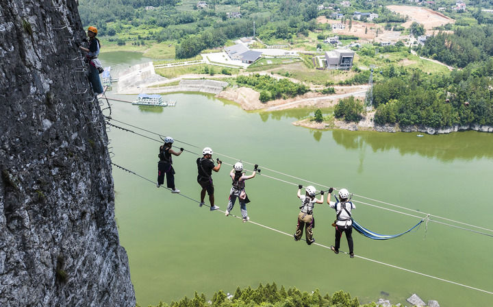 飞拉达项目的火爆,为恩施当地村民提供了大量就业机会,带动村民就业增收。教练郭晴是新塘乡本地村民,通过国家攀岩协会的考核转型为教练,还承担起团队管理工作。“我们教练团队在岗6人,全是本地村民,有的之前在浙江打工,大家都想在家门口找份稳定工作。”郭晴说,现在每月收入七八千元,在家门口已经很满足。