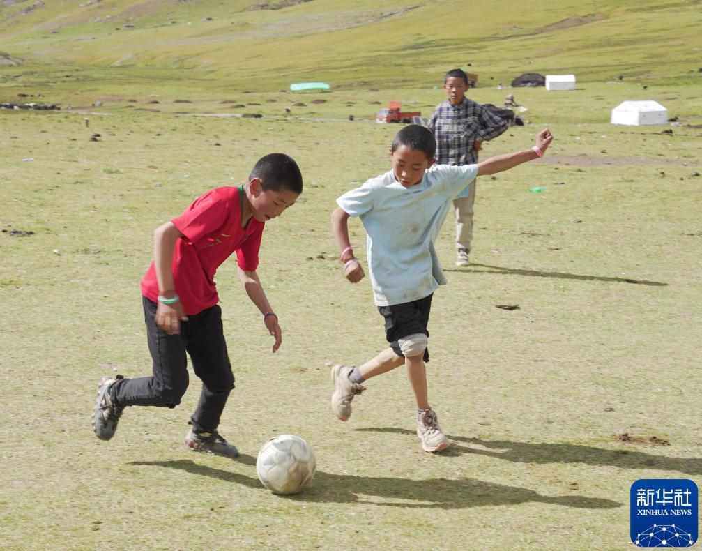 2024年8月23日,在青海省玉树藏族自治州囊谦县白扎乡巴麦村的夏季草场,孩子们在踢足球。新华社记者 柳泽兴 摄