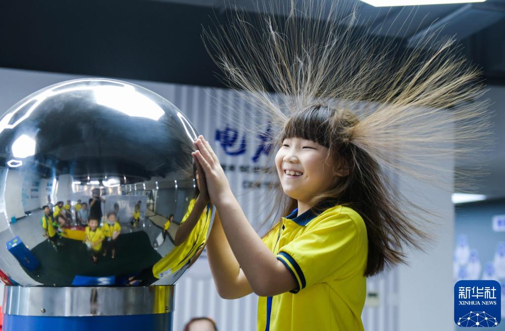 2020年8月14日,在浙江省余姚新时代文明实践基地内的科普中心,小朋友在体验静电发生器。新华社记者 徐昱 摄
