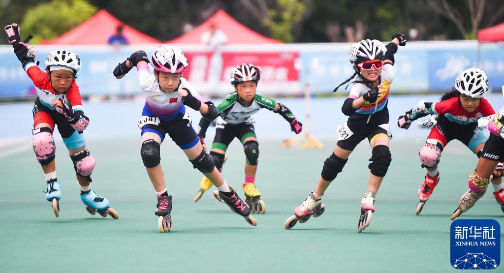 2024年7月28日,小朋友们在河南省洛阳市一体育公园内参加速度轮滑友谊赛。新华社发(黄政伟 摄)
