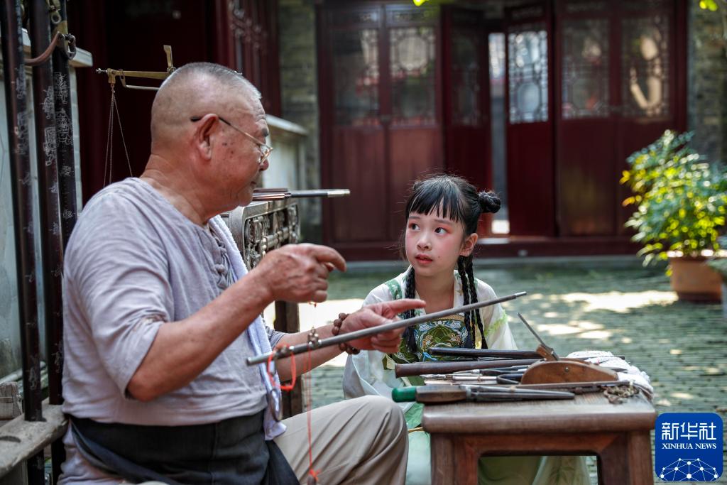 2024年8月24日,在江苏省兴化市昭阳街道成氏宅第,小朋友在观看非遗传承人制作木杆秤。新华社发(周社根 摄)