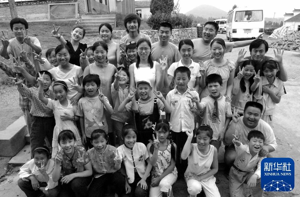 2003年7月3日,在金牛湖希望小学支教的南京师范大学12名学生与小学生们合影。新华社记者 孙参 摄