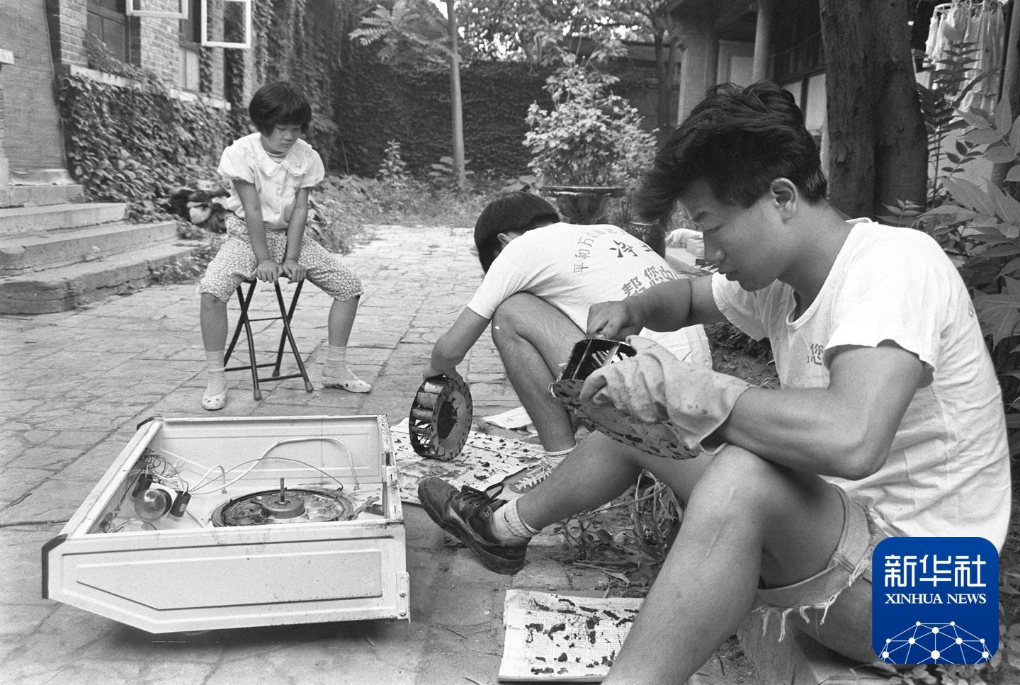 1992年,大学生在北京为客户清理抽油烟机。新华社发(钟鹏驰 摄)