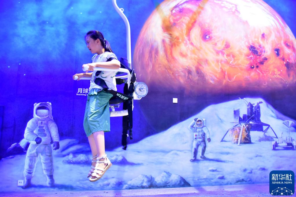 2024年8月24日, 学生在山东省枣庄市科技馆“宇宙探索”厅体验月球漫步。新华社发(刘明祥 摄)