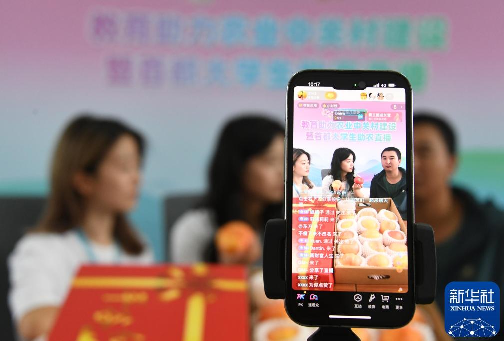 2024年7月12日,在北京市平谷区熊儿寨乡熊儿寨村,中国传媒大学学生与桃农一起直播销售桃子。新华社记者 任超 摄