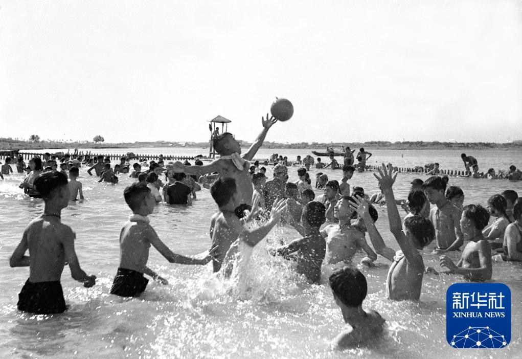 1956年7月26日,在湖北省武汉市少年先锋队队员夏令营中,孩子们在东湖游泳场做抢水球的游戏。新华社发