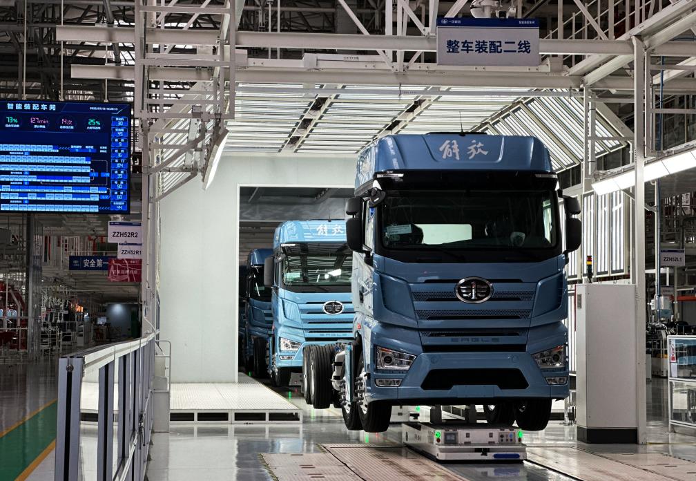 7月15日,一汽解放J7高端重卡驶下生产线。新华社记者 司晓帅 摄