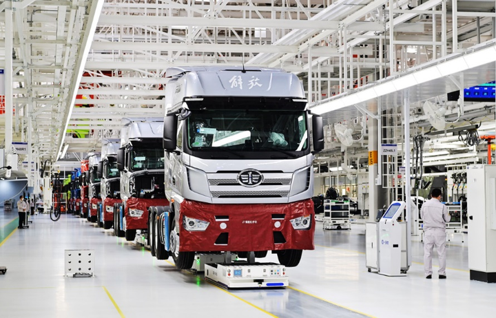 AGV(自动导航运输车)往来穿梭,多功能机器人挥舞手臂,数字孪生模型全程监控……一汽解放J7智能工厂内,一派热火朝天的生产景象。这个工厂是一座商用车智能制造“超级工厂”,集自动化、柔性化、数智化于一体,为解放高端重卡产销持续保持行业领军地位提供了坚实支撑。