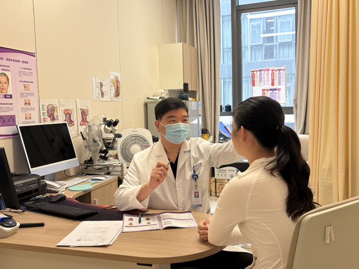 浙江省立同德医院整形美容科主任医师钱坚革面诊前来咨询医美项目的青少年。(受访者供图)