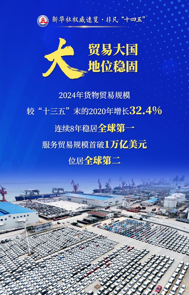 “十四五”期间,我国外贸实现逆势增长,贸易强国建设取得积极成效。商务部部长王文涛18日在国新办举行的“高质量完成‘十四五’规划”发布会上,用“大”“强”“韧”三个关键字,概括了我国贸易强国建设“成绩单”。跟随海报,一起看看吧。