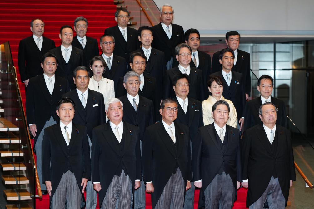 2024年11月11日,日本首相石破茂(前排中)在日本东京的首相官邸率阁僚合影。新华社记者张笑宇摄