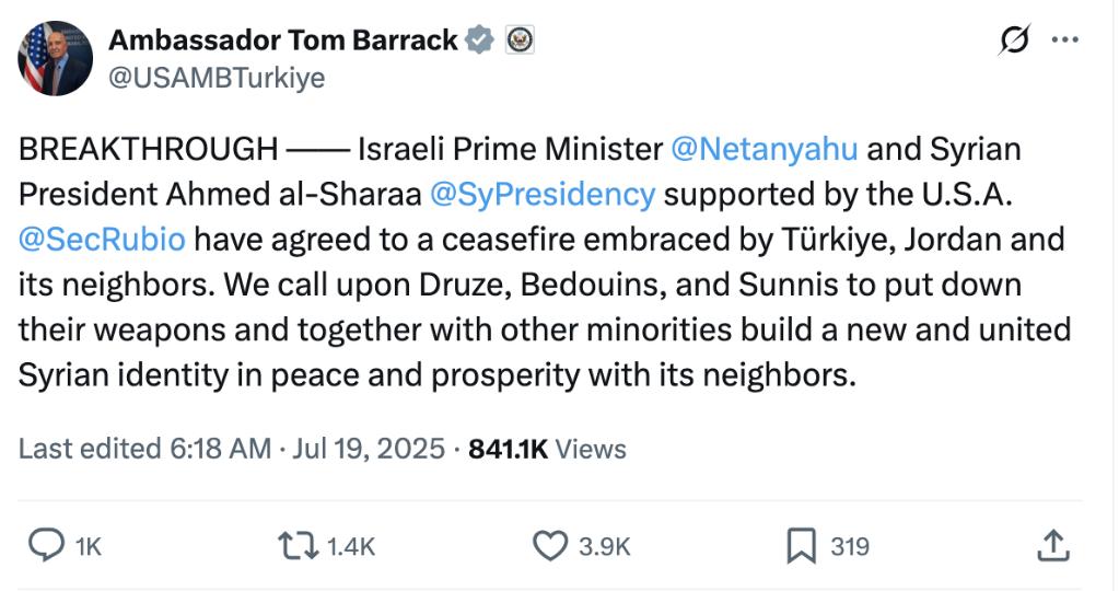 当地时间19日凌晨,巴拉克在社交媒体平台X上发文说,停火得到土耳其、约旦等邻国支持。他呼吁叙利亚德鲁兹人、贝都因人以及逊尼派放下武器,与其他少数群体一道建立一个全新的、统一的“叙利亚身份认同”,与邻国实现和平与繁荣。