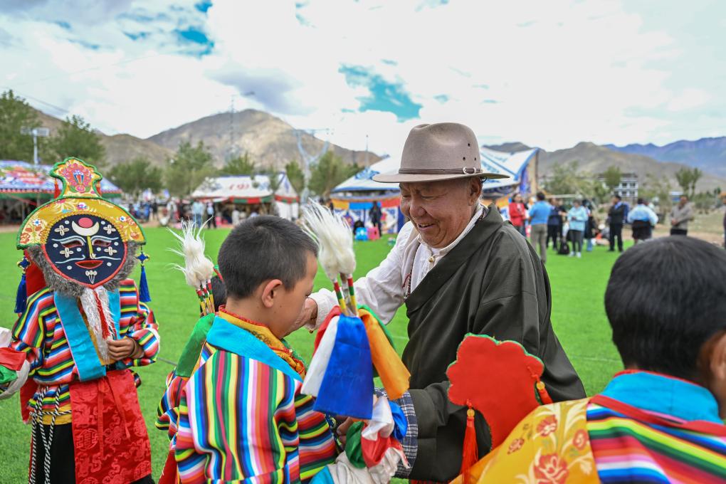 在展演活动候场区,一位老人忙碌的身影引人注目。76岁的湘巴藏戏国家级非遗代表性传承人次仁多吉正在给即将上台表演的小演员整理服装。