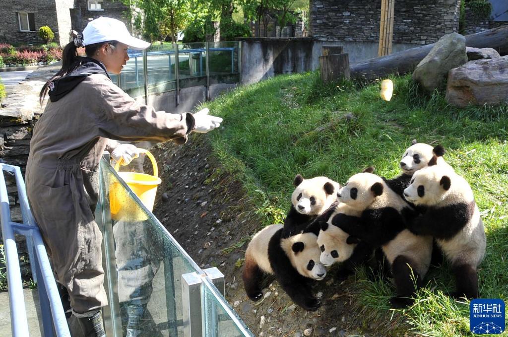 2008年5月23日,四川卧龙中国保护大熊猫研究中心的工作人员在给大熊猫投食。地震中可爱的大熊猫也受了惊吓,需要“心理治疗”。