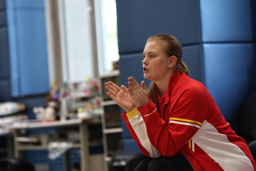 7月18日,汉娜·施瓦鲍尔在训练中为队员指导动作。新华社记者 潘昱龙 摄