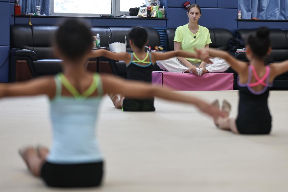 7月18日,辽宁金满星艺术体操队成年集体主教练马千惠(右一)指导队员训练。新华社记者 潘昱龙 摄