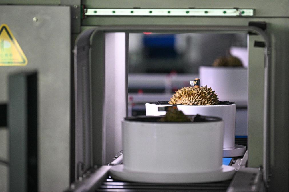 7月18日,在位于海南三亚的海南省优旗农业有限公司榴莲加工厂,国产榴莲在榴莲智能分选生产线上接受检测。新华社记者 蒲晓旭 摄