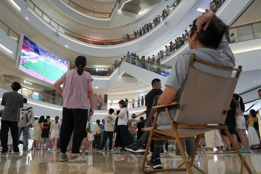 6月29日,市民、球迷在南通市内一处商场观看比赛直播。