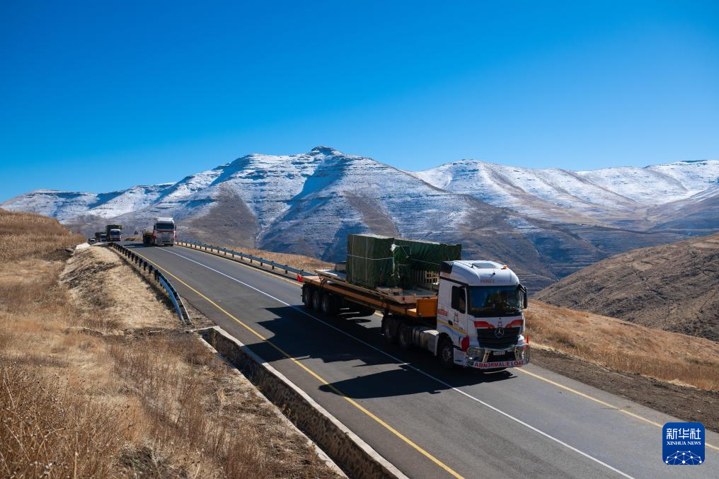 7月8日,在位于莱索托东部的塔巴-采卡地区,运送硬岩掘进机部件的卡车车队在山路上行进。新华社记者 杨光 摄