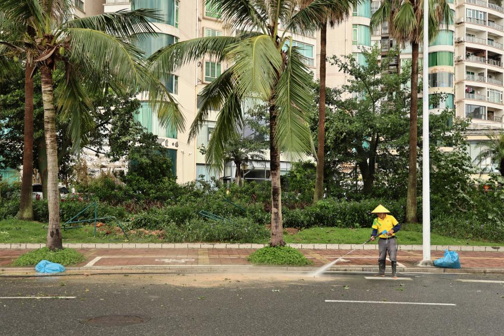 台风过后,广东省珠海市环卫工人正在对路面进行清洗。新华社记者 黄国保 摄