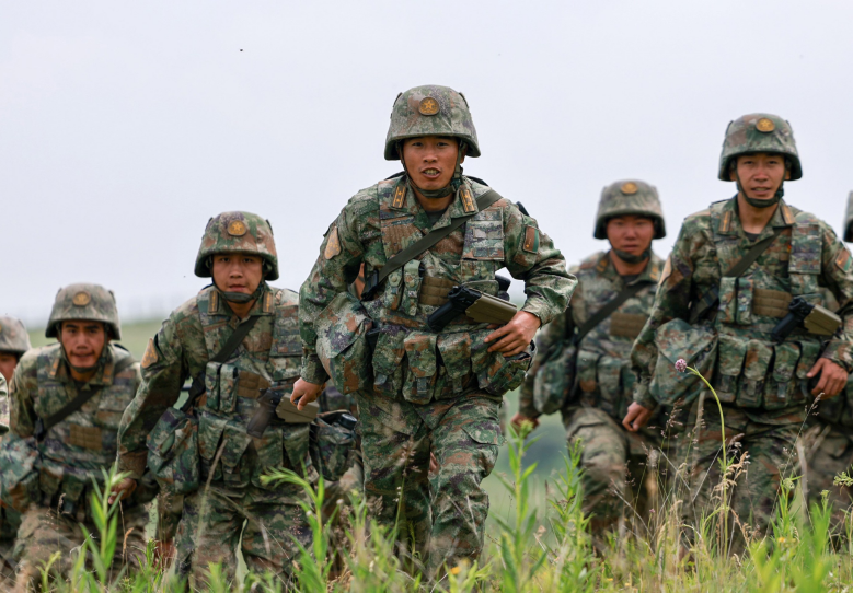 陆军第76集团军某合成旅红军营营长张灿灿(中)在武装越野训练中冲锋在前。崔获阳 摄