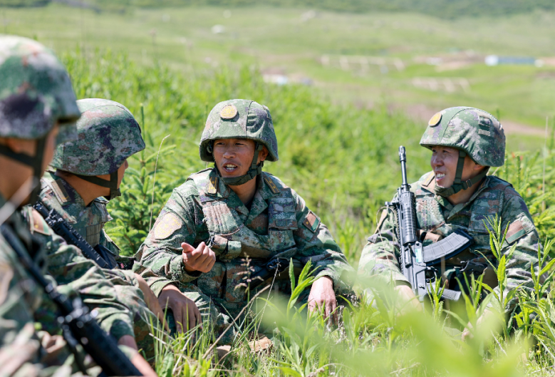 陆军第76集团军某合成旅红军营营长张灿灿(右二)在训练间隙与战士谈心。崔获阳 摄