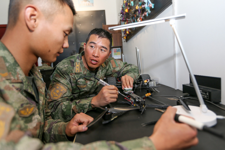 陆军第76集团军某合成旅红军营营长张灿灿(右)与官兵一起研究无人机。崔获阳 摄