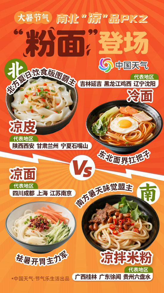 今天(7月22日)我国正式进入大暑节气,三伏天的大幕也已拉开。这一时节,北方“烧烤”、南方“焖蒸”,炎热感仿佛已经渗透进了我们的每一个毛孔。此时,南北方的餐桌放下了咸甜之争,消暑的“凉”品成为了大家共同追求。北方的凉皮、冷面、老刨冰……南方的凉面、拌粉、清补凉……这一口口凉的、酸的、辣的,是中国人对抗暑气的兵法,更是烟火人间里长出的活色生香。