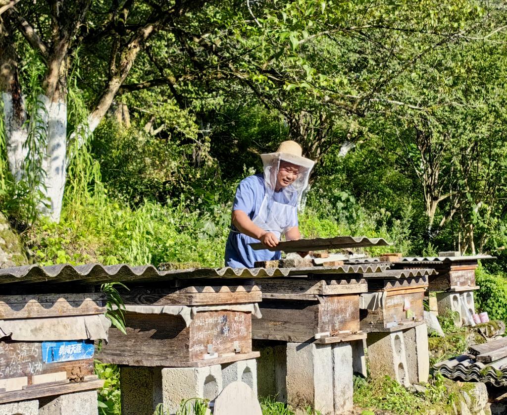 46岁的大古坪村村民吴彦君身兼“蜂农、电商人、导游”三重身份。花开时,他照看蜜蜂;采收完蜂蜜,就在线上线下销售;空闲时,他还在村里兼任导游。