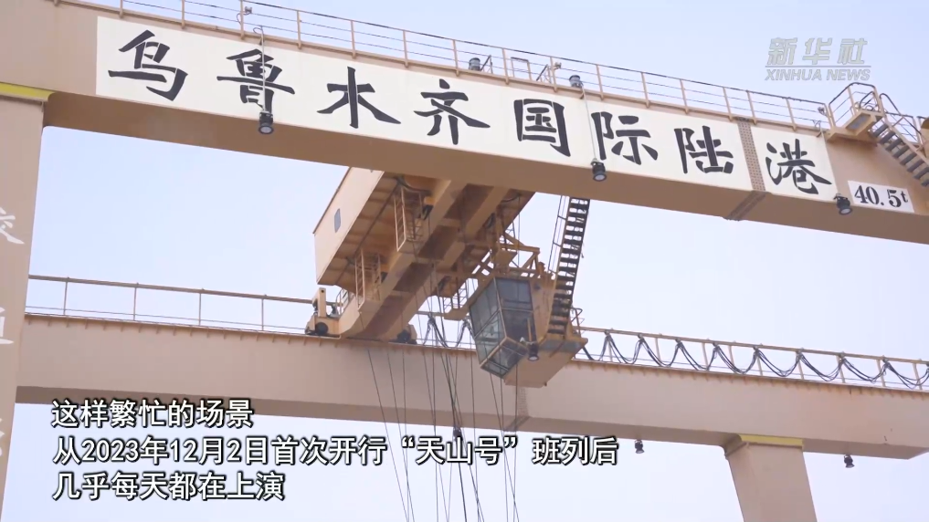 在乌鲁木齐国际陆港区多式联运中心,集装箱正面起重机抓取着一个个集装箱,登车落地、交替往来;另一边的中欧班列(乌鲁木齐)集结中心场站上,火车汽笛声不时响起,一批批货物搭乘中欧(中亚)班列、新疆“天山号”多式联运品牌班列,前往世界各地。这样繁忙的场景,从2023年12月2日首次开行“天山号”班列后,几乎每天都在上演。