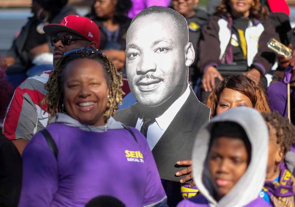 2019年1月21日,在美国洛杉矶,人们参加马丁·路德·金纪念日游行活动。新华社发(赵汉荣摄)
