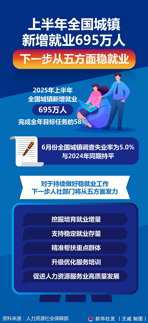 新华社北京7月22日电 题:上半年全国城镇新增就业695万人,下一步从五方面稳就业