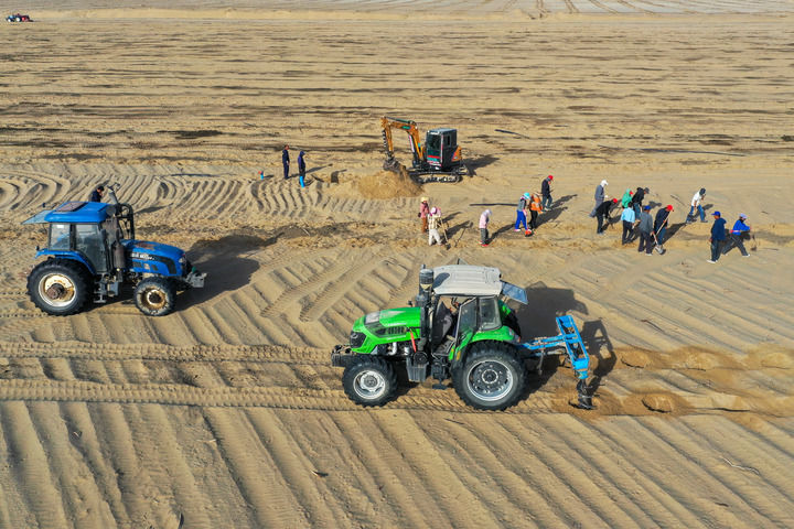 工作人员在新疆巴音郭楞蒙古自治州且末县唐农万物(且末)生态科技试验基地种植苗木(2025年4月9日摄,无人机照片)。新华社记者 丁磊 摄