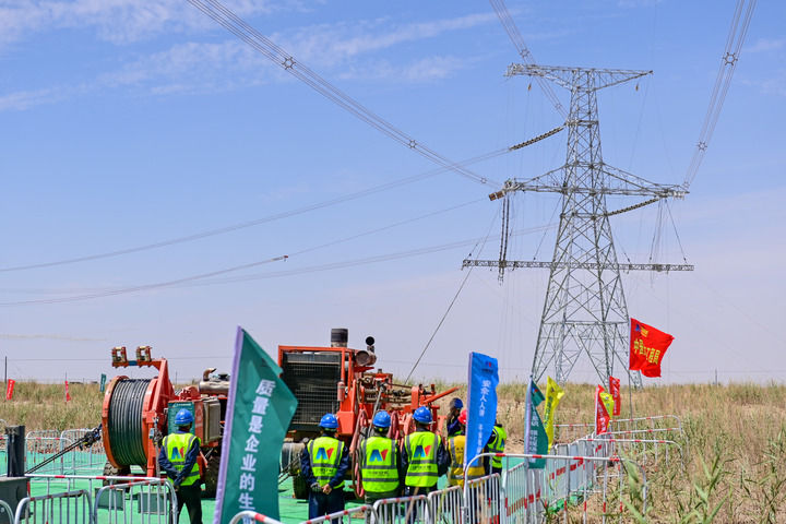 施工人员在新疆和田地区民丰县架设民丰—且末750千伏线路最后一段电线(2025年7月13日摄)。新华社记者 丁磊 摄