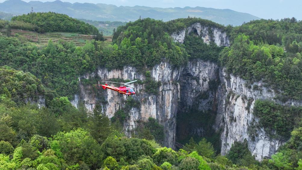 “右下方就是世界自然遗产天生三桥景区,张艺谋执导的《满城尽带黄金甲》在此取景拍摄。”机长沈玉茗操控直升机在空中盘旋,游客可以感受俯瞰天坑的震撼。