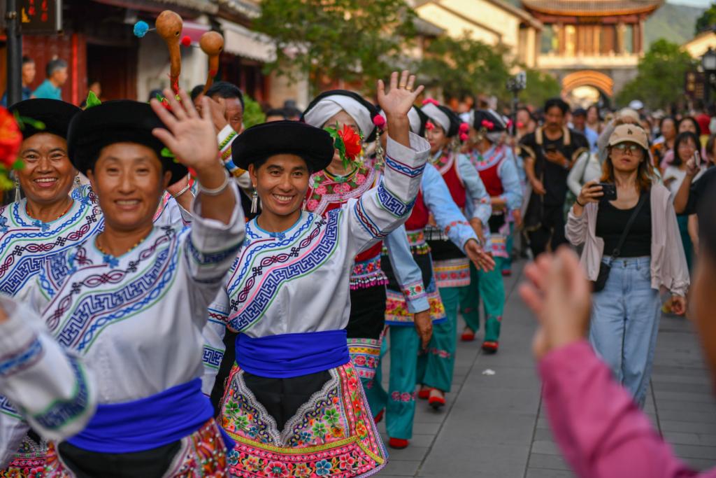 7月18日,彝族打歌队队员在巍山县南诏古街进行巡演时向游客挥手致意。新华社记者 彭奕凯 摄