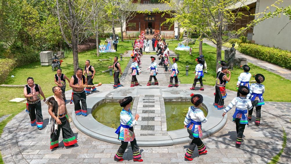 7月18日,彝族打歌队在巍山县文华书院进行排练(无人机照片)。新华社记者 彭奕凯 摄