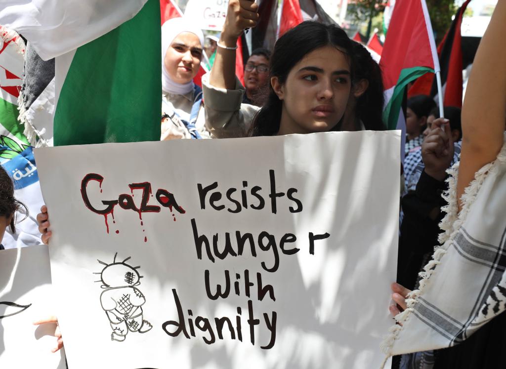 7月22日,巴勒斯坦民众在约旦河西岸城市纳布卢斯示威,抗议以色列对加沙实施的饥饿政策。新华社发(艾曼·诺巴尼摄)