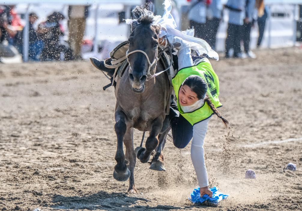 首轮比赛中,孟根陶丽第11个出场,她还是那套熟练的动作:策马、俯身、探臂,精准地拾起10根哈达,起身、再俯身、探臂,再拾起10根哈达。随着她撒落手中的哈达,现场爆发出热烈的掌声和欢呼声。