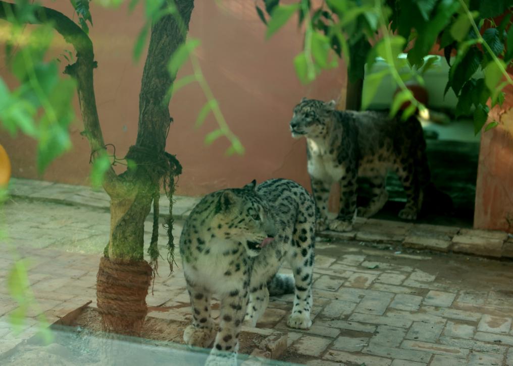 在青海省西宁市西宁野生动物园,雪豹“亮亮”“凌夏”在展馆内活动。新华社记者 李宁 摄