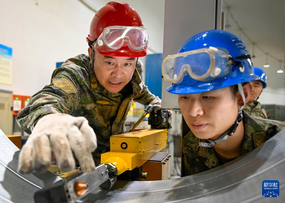 火箭军某旅工程安装技师、一级军士长崔道虎(左)帮带战友查找排除设备故障(资料照片)。新华社发(刘明松 摄)
