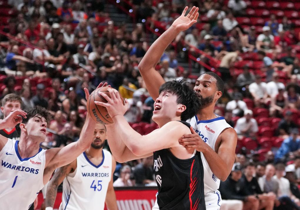 7月11日,在2025年NBA夏季联赛中,波特兰开拓者队106:73战胜金州勇士队。这是中国球员杨瀚森(前)在NBA出战的首场比赛。新华社发(孙宇轩摄)