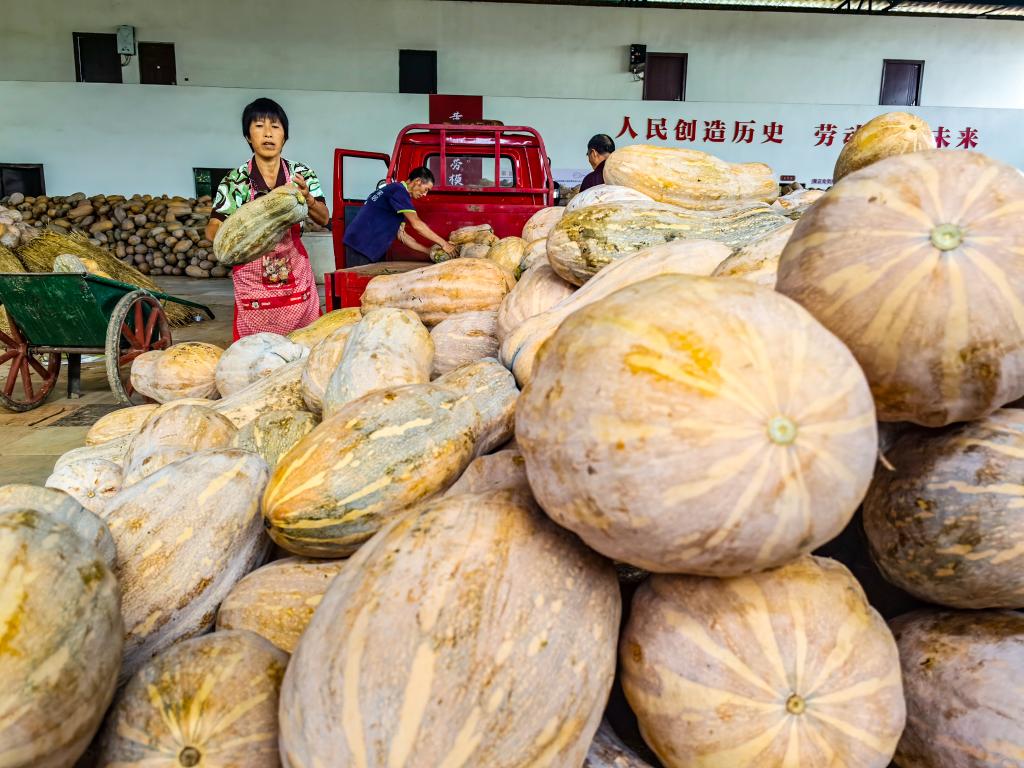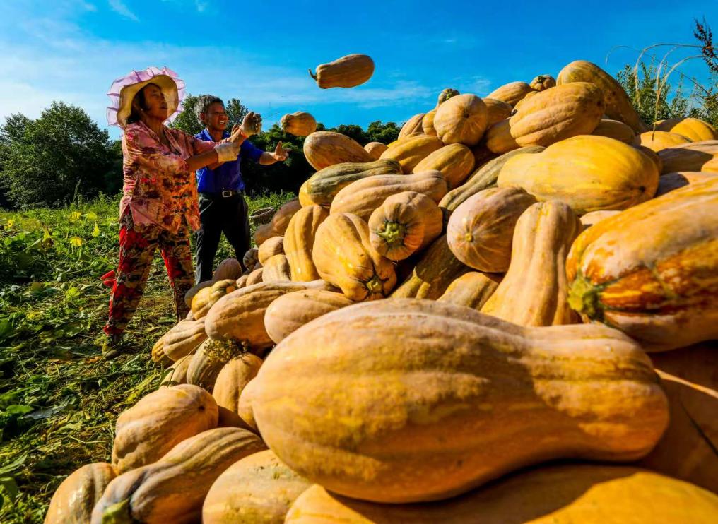农户们正在采收南瓜。(龚长浩摄)