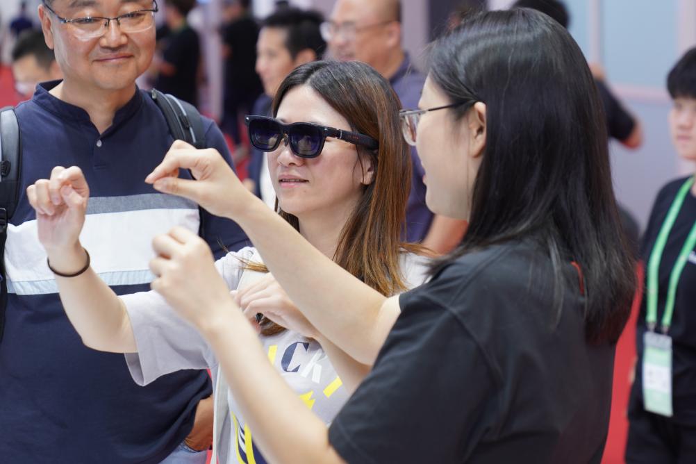 7月16日,在第三届中国国际供应链促进博览会上,参观者体验一款智能眼镜。 新华社记者 戴明轩 摄