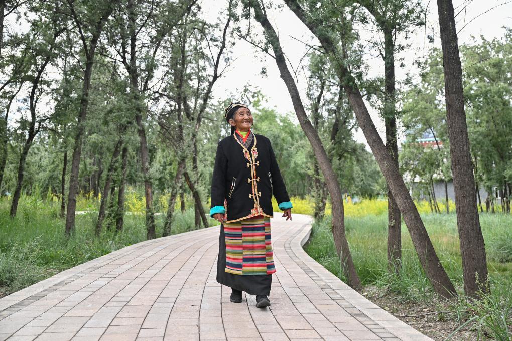 桑旦在隆子县沙棘林生态公园内散步。新华社记者 李鑫 摄