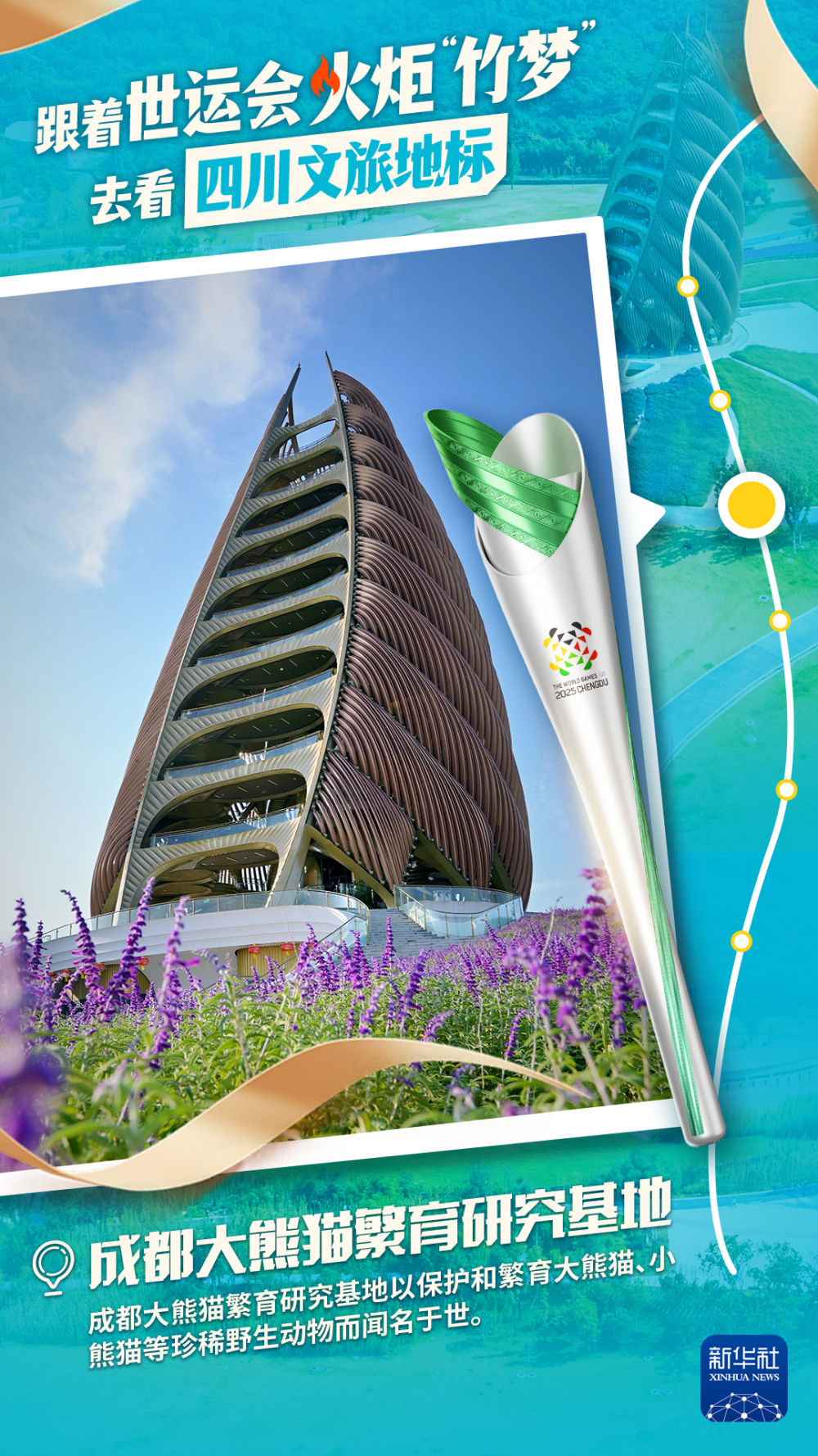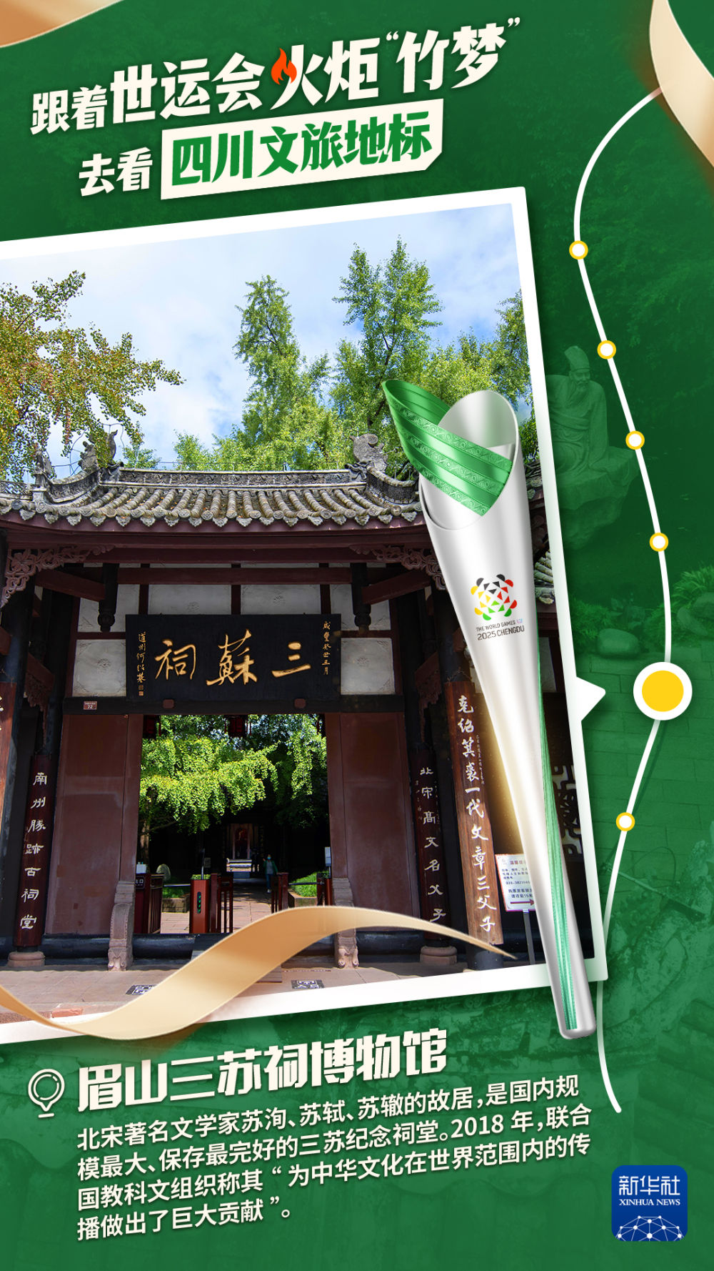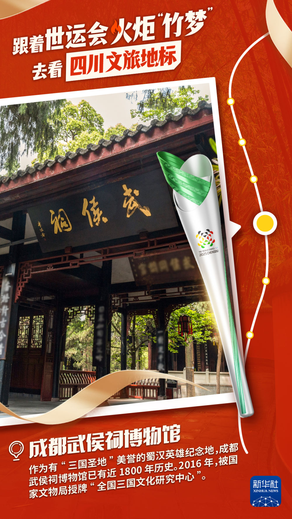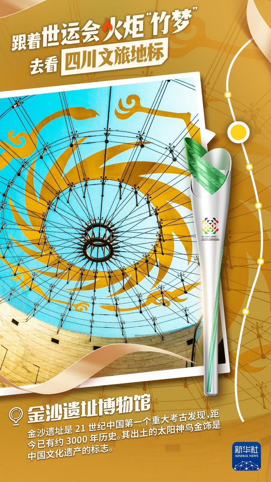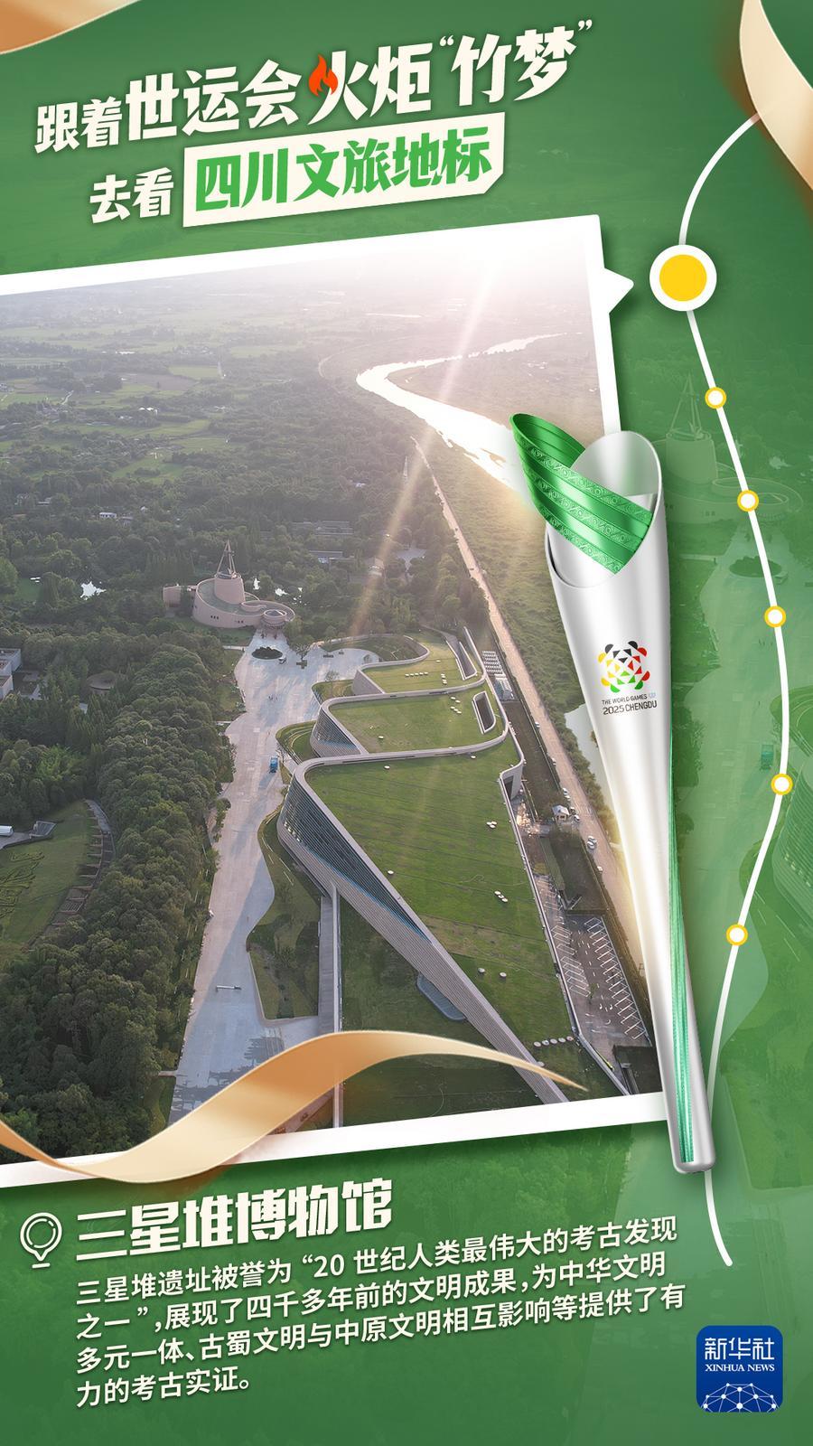 2025年7月26日,第12届世界运动会火炬传递在三星堆博物馆启动,拉开世界运动会历史上的首次火炬传递之旅。一日之中,成都世运会火炬“竹梦”将“穿越”成都、德阳、眉山三市,途经6个文旅地标,沿着11公里的传递路线,尽显三星堆古蜀文明、金沙太阳神鸟、熊猫生态家园、蜀汉英雄纪念地、三苏文脉传承以及兴隆湖湿地公园的文旅美韵。