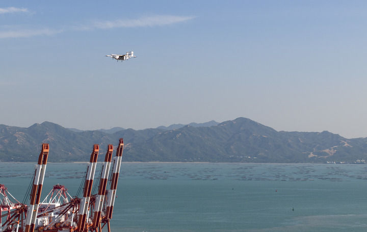 丰翼科技(深圳)有限公司的一架无人机搭载着快件从深圳蛇口集装箱码头附近的起降点起飞,准备飞往中山(2024年11月27日摄)。新华社记者 毛思倩 摄