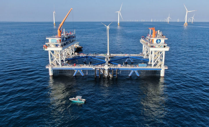 这是在广东汕尾拍摄的中广核“伏羲一号”风渔融合网箱平台(2024年9月2日摄,无人机照片)。新华社记者 邓华 摄