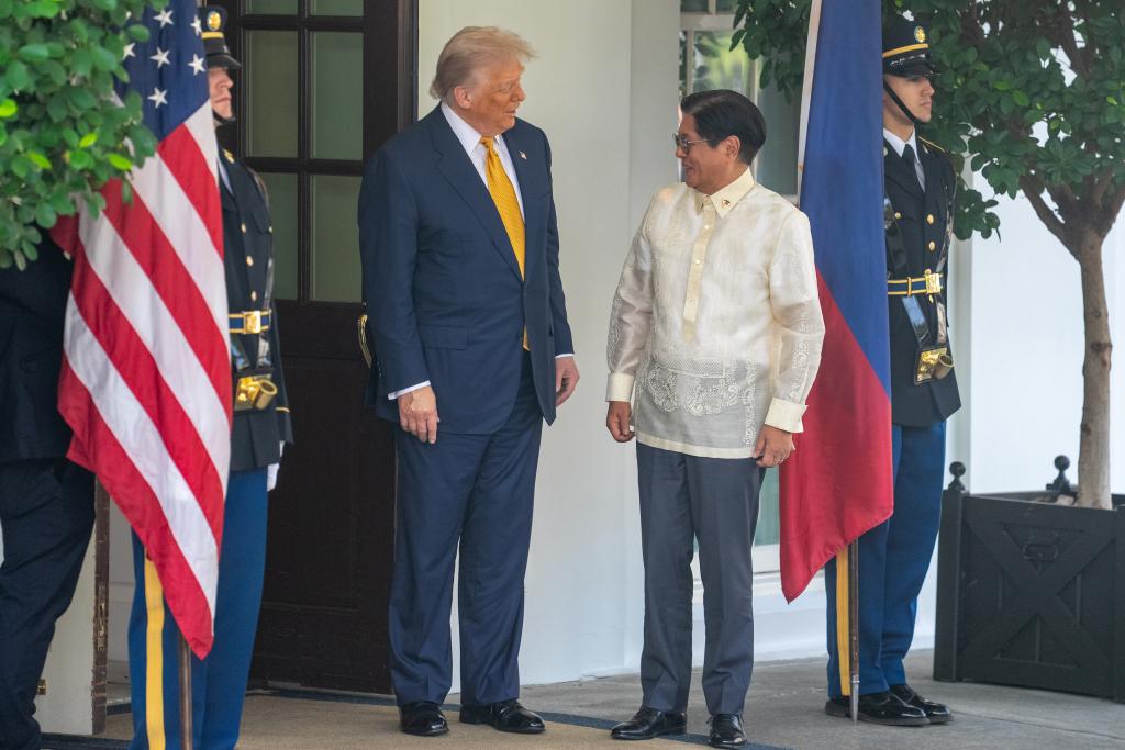 7月22日,美国总统特朗普(左二)在华盛顿白宫欢迎到访的菲律宾总统马科斯(右二)。新华社记者胡友松摄