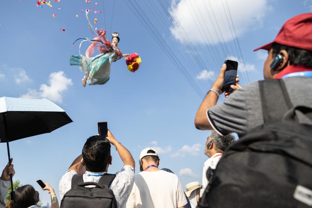 7月26日,上海合作组织媒体智库峰会与会嘉宾在河南开封清明上河园拍摄“大宋飞天秀”。新华社记者 白雪骐 摄